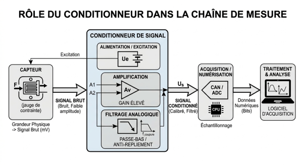[Image du rôle du conditionneur dans la chaîne de mesure : Capteur -> Conditionneur (Alimentation, Amplification, Filtrage) -> Acquisition]