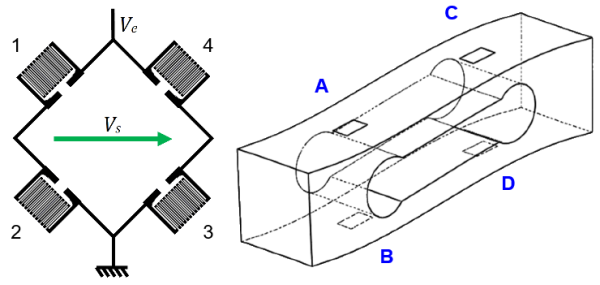 [Image du schéma électrique d’un pont de Wheatstone complet avec les quatre jauges actives]